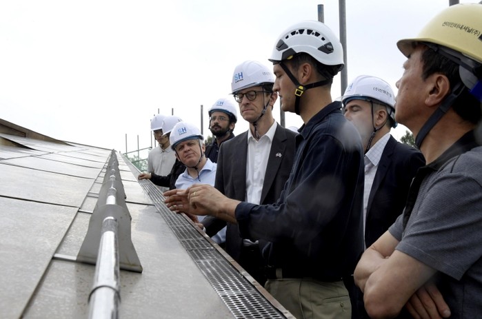 | ▲ ‘홍련봉 보루 유구보호시설’ 건립 현장에서 설명을 듣고 있는 필립 베르투 주한 프랑스 대사 |