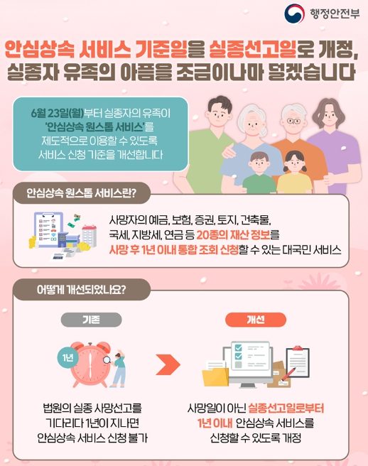 6월 23일(월)부터 실종자의 유족이 '안심상속 원스톱 서비스'를 제도적으로 이용할 수 있도록 서비스 신청 기준을 개선합니다.