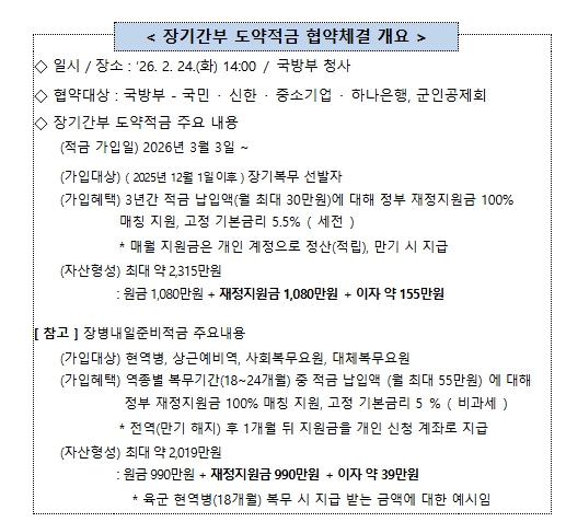 안규백 국방부장관 주관으로 2월 24일, 국방부 청사에서 국민은행, 신한은행, 중소기업은행, 하나은행, 군인공제회와 ‘장기간부 도약적금’ 업무협약을 체결하고, 협약 이행을 위해 상호 긴밀히 협력할 것을 약속했다.