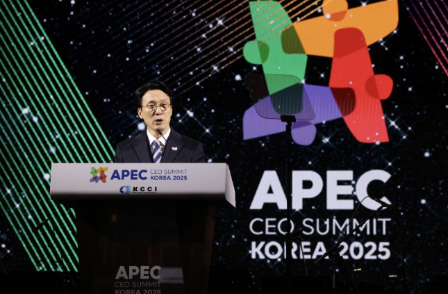 | ▲ 김민석 국무총리가 28일 경주 화랑마을 어울마당에서 열린 '2025 APEC CEO 서밋'의 첫 번째 공식 행사인 환영만찬에 참석, 축사를 하고 있다. |