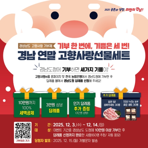 [파이낸셜경제=김예빈 기자] 경상남도는 연말정산 시즌을 맞아 12월 3일부터 14일까지 12일간 ‘고향사랑기부제 연말 특별 이벤트’를 진행한다.