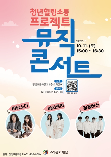 장생포문화창고 관계자는 “이번 공연은 청년들이 음악을 통해 잠시나마 위로와 힐링의 시간이 되길 바라는 마음으로 준비했다”며“앞으로도 시민들의 삶에 활력을 불어넣는 다양한 기획공연을 이어가겠다”고 밝혔다.