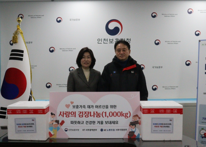 [파이낸셜경제=김기보 기자] 국가보훈부 인천보훈지청은 12월 3일 KT서부광역본부 후원으로 관내 거주 저소득 보훈 가족 100가구에 김장김치 1000kg을 전달했다.