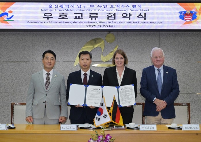 [파이낸셜경제=김예빈 기자] 울산 남구(구청장 서동욱)가 제29회 울산고래축제를 방문한 독일 오버우어젤시(시장 안티에 룽게)와 우호교류 협약을 체결했다.