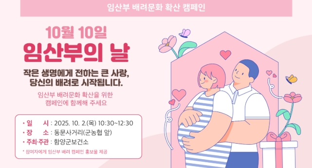 | ▲ 함양군은 오는 10월 2일 함양읍 일원에서 ‘2025 임산부의 날 기념 캠페인’을 개최한다. 이번 캠페인은 임산부에 대한 존중과 배려 문화를 확산하고, 군민의 인식 개선과 공감대 형성을 위해 마련됐다. |