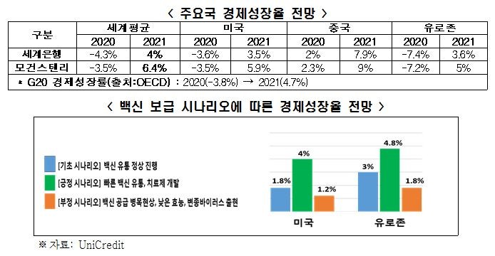 이미 작년 하반기부터 코로나19 이전 수준으로 생산을 회복한 중국이 7.9% 성장으로 세계 경제성장을 견인하며, 올해 3.6% 성장이 전망되는 유로존은 작년 세계 최저수준 침체(-7.4%)로부터의 반등효과가 가장 높을 것으로 전망된다. 중국을 제외한 신흥개도국의 경우 백신 보급 속도가 낮아 신흥국 성장률(3.4%)이 G20국가(4.7%)보다 낮은 상황이 전개될 전망이다. 동시에 코로나 타격이 적은 베트남(6.7%), 말레이시아(6.7%) 등 아시아 일부 신흥국은 새로운 밸류체인으로 부상할 것으로 예상된다. 한편, 국제비즈니스의 완전한 정상화는 2021년 하반기에 가능할 것으로 예측되었다.