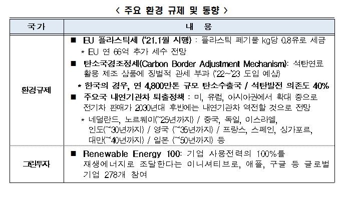 2021년 신기후체제(파리협정)가 출범하고 미국이 시의 적절히 파리협정에 복귀하면서 저탄소경제 전환의 변곡점이 마련될 전망이다. 미국·EU가 주도해 온 기후변화 어젠다에 최근 한중일이 모두 2050년까지의 탄소중립을 선언*하는 등 국제사회의 참여도 광범위해졌으며, 프랑스, 독일, 영국 등 EU 주요 선도국은 탄소중립을 법제화하는 단계까지 나아가고 있다. 기업활동에 직격탄이 될 환경규제 또한 본격화될 전망으로, EU는 올해부터 플라스틱세를 시행하며 탄소국경세 도입도 예고하고 나섰다. 美 바이든 행정부 또한 저탄소 이행과 무역협정을 연계하는 정책방향을 제시한 가운데, 세계 최대자산운용사 블랙록은 ‘20년부터 석탄사용 매출이 25%가 넘는 기업의 채권, 주식 처분을 시작했다.