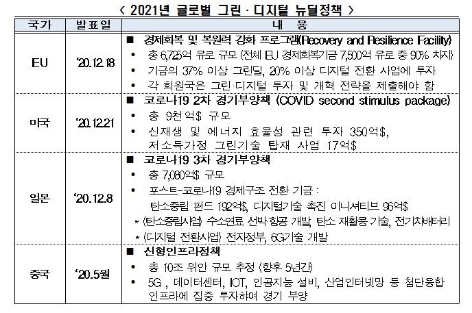 세계 각국이 본격적인 경기부양 정책을 추진할 것으로 예상되는 가운데, 2021년 시행되는 전세계 코로나19 경제대책을 아우르는 공통적인 테마는 그린 및 디지털 뉴딜이다. EU의 경우 경제회복기금 중 대부분을 차지하는 경제회복 및 복원력 강화 프로그램(Recovery and Resilience Facility)의 최소 37% 이상을 그린 연관 투자에, 20% 이상을 디지털 전환에 투자한다. 일본 또한 그린·디지털 기금이 포함된 2021년 경기부양책을 발표하며 스가 총리가 코로나19 이후의 경제구조 전환을 위해 그린산업 및 디지털화 촉진으로 성장 돌파구를 찾겠다는 계획을 강조했다.