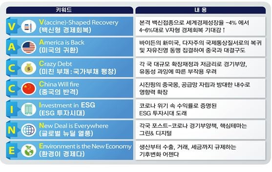 [파이낸셜경제=김윤정 기자] 본격 백신 보급으로 2020년을 물들였던 코로나19 악몽 극복의 기대감이 전 세계적으로 고조되는 가운데, 전국경제인연합회는 2021년 글로벌 경제와 비즈니스 활동에 영향을 줄 것으로 예상되는 일곱 가지 특징을 V.A.C.C.I.N.E으로 제시하였다.