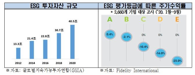 투자 의사결정 시 ESG 지표를 평가하는 세계적인 흐름이 코로나 이후 탄력을 받을 전망이다. 글로벌 ESG 투자자산 규모는 ’20년 40조5천억 달러까지 도달하며 지속 증가해 왔으나, 그동안 ESG투자는 윤리경영 관점의 의미 외의 수익성에 대한 의문이 제기되기도 했다. 그러나 코로나19 타격으로 인한 위기상황에서 ESG 高등급 기업이 수익 측면에서도 선방한 것으로 나타났다. S&P에 따르면 2020년 상반기 ESG 펀드 17개 중 14개가 1.8%~20.1%의 수익률을 보여 S&P500 평균수익률(1.2%)을 뛰어넘는 성과를 나타냈다. 또한 코로나19 강타기간(‘20.1~9월) 중 2,660개사 주가수익률 분석 결과에 따르면, ESG 평가등급이 높을수록 이에 비례하여 높은 주가수익률을 나타내었다.