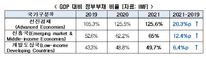 코로나19 강타 이후 ‘20년 말 글로벌 부채가 역사상 최대치인 약 277조 달러 규모에 도달한 가운데, 대규모 경기부양책을 집행한 주요국의 공공부채가 크게 늘어난다. 미국 등 선진경제의 2021년 국내총생산 대비 정부부채는 2019년 대비 20.3%포인트 증가한 125.6%에 육박할 전망이다. 또한 지난해 3월부터 시작된 美 연준의 제로금리를 위시하여 전 세계적인 역사상 최저금리 현상이 올해도 지속될 전망이다. 제로금리와 지속적인 정부지출 확대가 유지됨에 따라 글로벌 유동성 과잉으로 인한 부채 위기가 우려된다. 궁극적으로 금리상승 및 긴축의 시간이 다가오면 기초체력이 부족한 국가가 부담할 사회, 경제적 고통이 클 것으로 예상된다.
