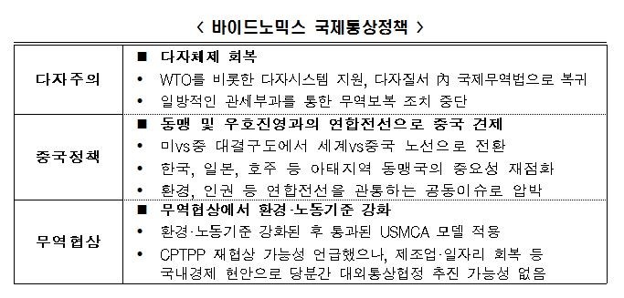 바이든 행정부 출범으로 미국이 국제통상체제를 주도하는 선도력을 회복하면서 자유진영간 동맹이 강조될 전망이다.