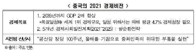 중국은 장기적인 패권경쟁에 맞서 반격을 준비할 모양새다. 지난 40년간의 개혁개방 시대에서 내부 역량강화 및 국가 현대화의 시대로 본격 전환한다. 출범하는 경제5개년계획은 크게 국내대순환과 국제대순환의 쌍순환을 핵심으로 한다. 국내대순환은 ①내부 자립 공급망을 건설하여 미국·유럽시장 의존도를 낮추고, ②반도체 등 필수기술 자립을 이룬다는 것이 골자이며, 국제대순환(대외개방)은 수출에 더하여 중국의 거대 내수시장을 개방하여 외투기업들의 對중국 의존도를 높여 영향력을 강화한다는 계획이다.