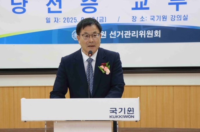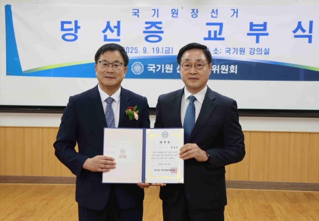 | ▲ 국기원 선거관리위원회 위원장(오른쪽)으로부터 윤 당선인이 당선증을 전달받았다. |