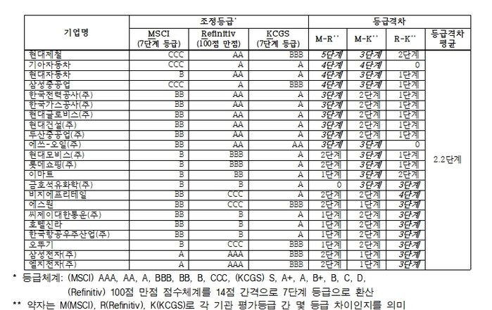 매출액 100대 기업에 대한 MSCI·레피니티브·지배구조원 등급 차 평균 1.4단계