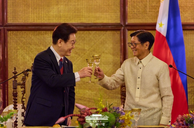 이재명 대통령은 만찬사에서 “77년 전 오늘은 대한민국과 필리핀 간의 뜻깊은 우정과 연대, 동행의 역사가 시작된 날”이라면서 “도움이 필요할 때마다 기꺼이 우리 국민의 손을 맞잡아 준 필리핀이 있어 ‘글로벌 책임 강국’으로 우뚝 설 수 있었다”고 감사를 전했다.
