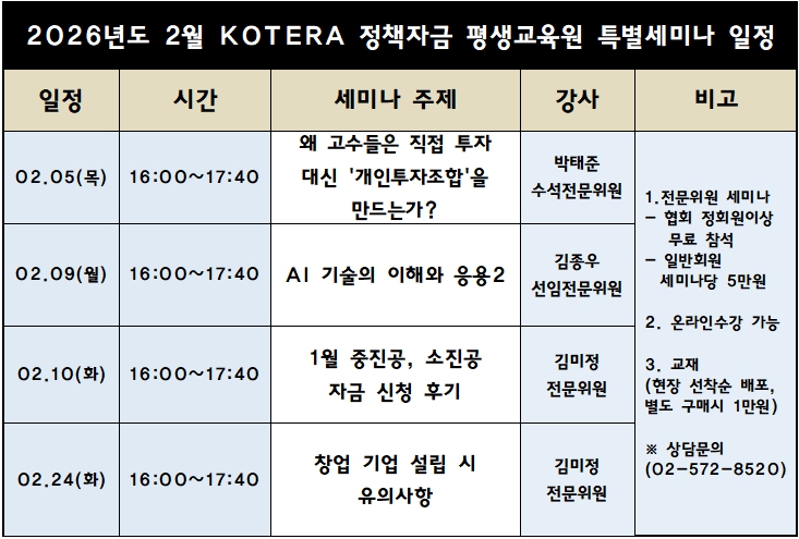 2월 KOTERA 정책자금 평생교육원 특별강좌는, '왜 고수들은 직접 투자 대신 '개인투자조합'을 만드는가?', 'AI 기술의 이해와 응용2', '1월 중진공, 소진공자금 신청 후기', '창업 기업 설립시 유의사항' 등 다양한 주제로 진행된다.