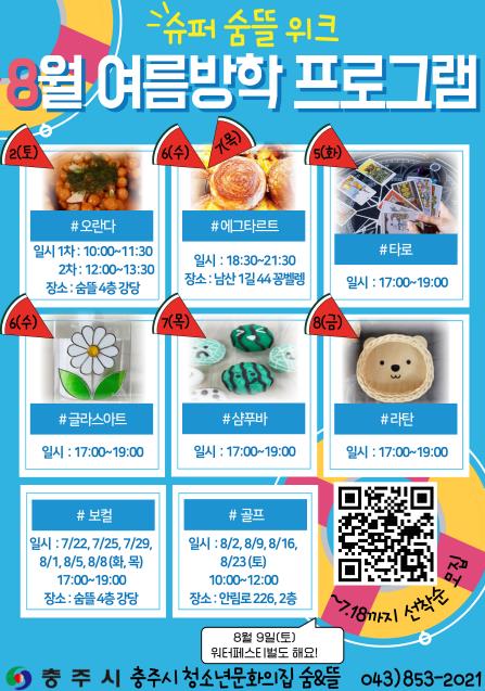 [파이낸셜경제=김기보 기자] 충주시청소년문화의집 숨·뜰은 여름방학을 맞이해 지역 아동·청소년을 대상으로 7월 22일부터 8월 23일까지 진행되는 다양한 여름방학 프로그램을 마련했다.