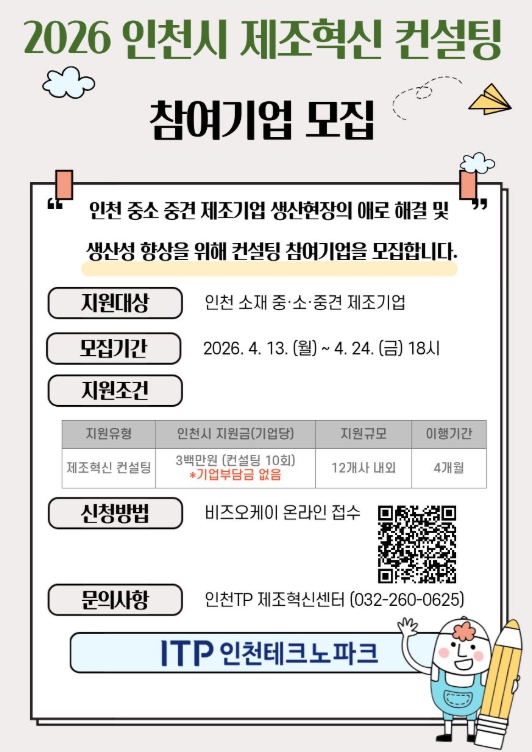 [파이낸셜경제=김기보 기자] 인천테크노파크(인천TP)는 지역 중소·중견기업 제조 현장의 스마트화와 AX(AI 전환)·DX(디지털 전환)를 촉진하기 위해 ‘2026 인천시 제조혁신 컨설팅 지원사업’ 참여기업을 24일까지 모집한다고 밝혔다.