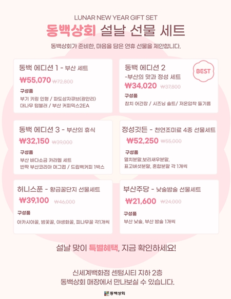 [파이낸셜경제=박영진 기자] 부산시와 부산경제진흥원은 부산 우수 제품 쇼핑 숍 '동백상회'에서 설 명절을 앞두고 지역기업 제품으로 구성된 '선물 세트'를 출시하고, 동백상회 제품 구매 고객 대상 사은품 증정 행사를 진행한다고 밝혔다.