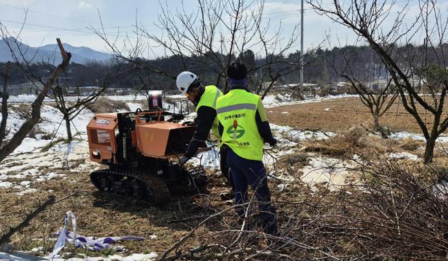 | ▲ 지난 2월 영농 부산물 파쇄단이 농가를 찾아 영농 부산물 파쇄를 지원하는 모습 |