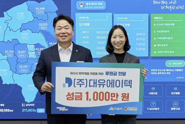 [파이낸셜경제=김영란 기자] 아산시는 18일 ㈜대유에이텍으로부터 지역 내 취약계층 아동 지원을 위한 성금 1천만 원을 기탁받았다.