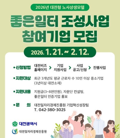 [파이낸셜경제=김영란 기자] 대전시는 1월 21일부터 2월 12일까지 대전형 노사상생 모델‘2026년 좋은 일터 조성사업’에 참여할 12개 기업을 공개 모집한다.