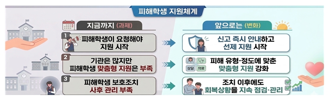 피해학생 관점에서 지원 체감도를 높이기 위해 사안처리 전 과정에서 피해학생 지원 체계를 재정비한다. 이전에는 피해학생과 학부모가 지원받을 수 있는 서비스를 찾아다녔다면, 앞으로는 학교폭력 신고·접수 시 학교장이 피해학생에게 지원 가능한 서비스, 보호조치와 절차를 신속하게 안내하도록 제도를 개선할 예정이다.