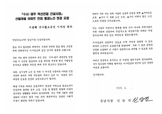 [파이낸셜경제=김기보 기자] 성남시는 지난 16일 김윤덕 국토교통부 장관과 이성해 국가철도공단 이사장에게 ‘수서~광주 복선전철(이하 수광선) 건설사업’과 관련하여 여수동 산들마을 아파트 인접 통과 구간의 노선 변경을 요청하는 서한을 전달했다고 20일 밝혔다.