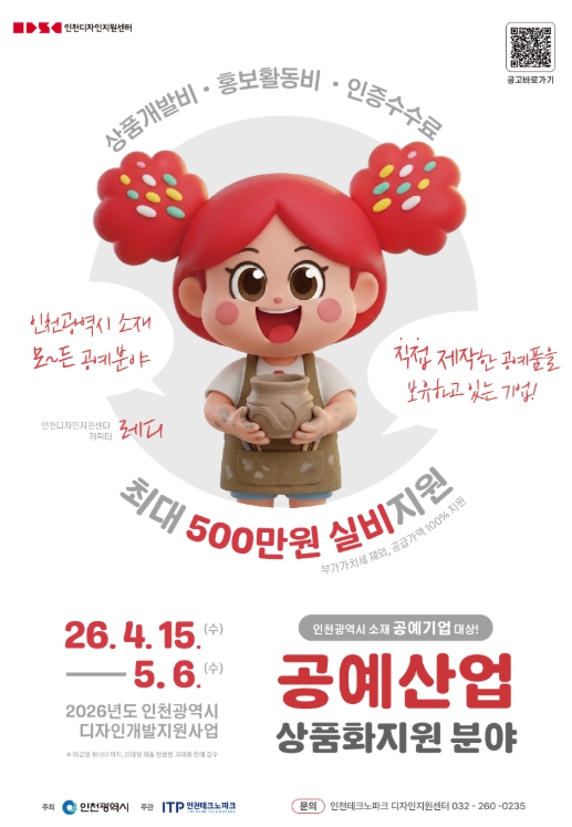 [파이낸셜경제=김기보 기자] 인천테크노파크(인천TP)는 인천 공예기업의 상품 경쟁력 강화를 위해 ‘2026년도 인천광역시 공예산업 상품화 지원사업’ 참여기업을 오는 5월 6일까지 모집한다.
