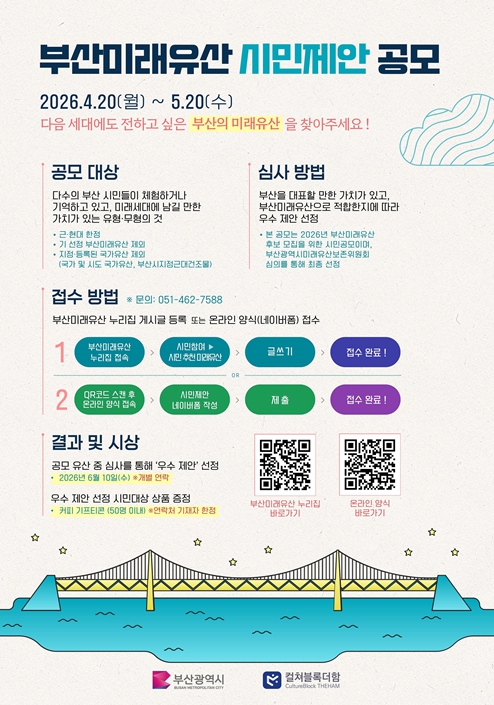 접수는 부산미래유산 누리집에서 게시글을 작성하거나, 큐알(QR)코드 온라인 양식을 통해 할 수 있으며, 우수 제안자에게는 커피 기프티콘(50명 이내)을 제공할 예정이다.