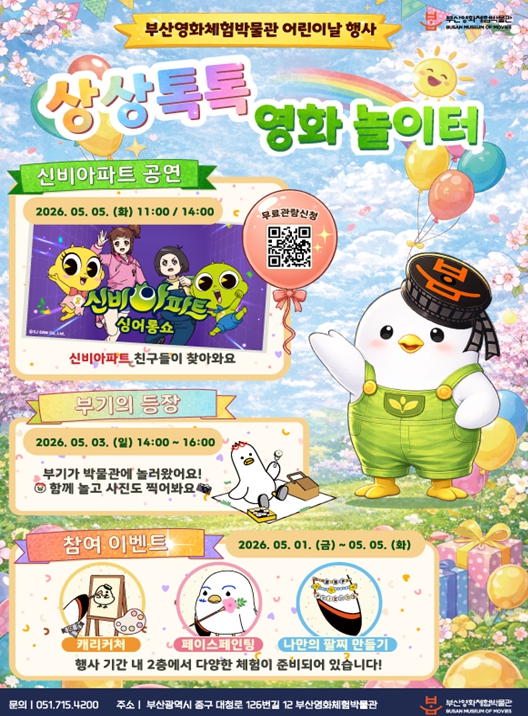 [파이낸셜경제=박영진 기자] 부산시는 부산영화체험박물관(관장 박채성, 중구 소재)에서 어린이날을 맞아 어린이와 가족 관람객을 위한 특별 행사 '상상톡톡 영화 놀이터 : 다 같이 놀자!'를 오는 5월 1일부터 5일까지 5일간 개최한다고 밝혔다.