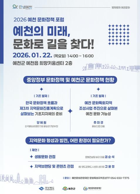 예천 문화특화지역 조성사업 '영차영차 예천문화'의 일환으로 추진하는 이번 포럼은 22일 ‘문화정책 포럼’을 시작으로 ‘협력 거버넌스 포럼’이 세 차례에 걸쳐 이어진다.
