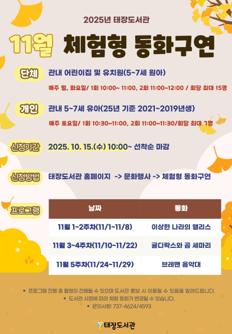 ▲ 원주시 태장도서관, 11월 체험형 동화구연 운영 |