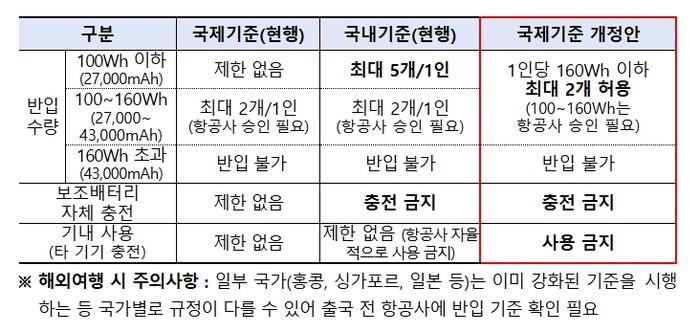 기존 국제기준에서는 일반인이 가장 많이 사용하는 100Wh(27,000mAh) 이하 보조배터리에 대한 반입 수량 제한이 없어, 국내 기준을 마련하여 1인당 5개까지 제한했으나, 앞으로는 신설된 국제기준에 따라 보조배터리(Power bank)는 1인당 최대 2개(160Wh/43,000mAh 이하)로 반입이 제한된다.