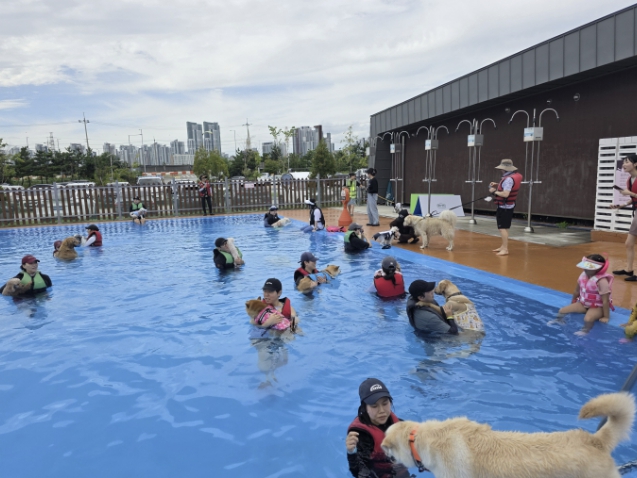 | ▲ 시흥시 월곶에코피아 수영장에서 반려동물 수영 문화교실 ‘멍푸멍푸’가 열리고 있다. |