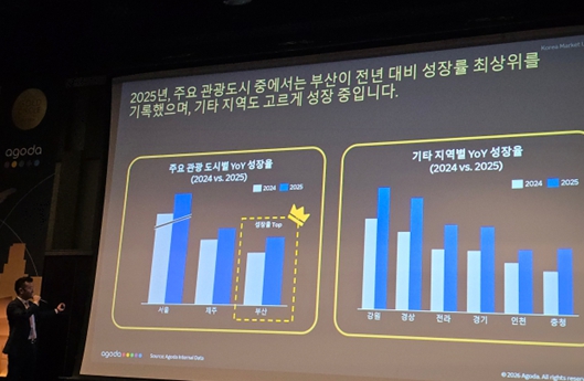 아고다(Agoda)는 다양한 국적의 여행객 유입 확대와 함께 전년 대비 숙소 검색량이 84퍼센트(%) 증가하는 등 한국 여행 수요가 지속적으로 늘고 있으며, 부산시의 적극적인 관광 정책과 지원이 숙박업계 경쟁력 강화와 방문객 유치 확대에 긍정적인 영향을 줬다고 밝혔다.