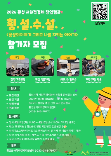횡성군 사회적경제 지원 센터는 지역 내 사회적경제 활성화와 창업 생태계 조성을 위한 ‘2026 횡성 사회적경제 창업 캠프 '횡.설.수.설.'’ 참가자를 모집 중이라고 4일 밝혔다.