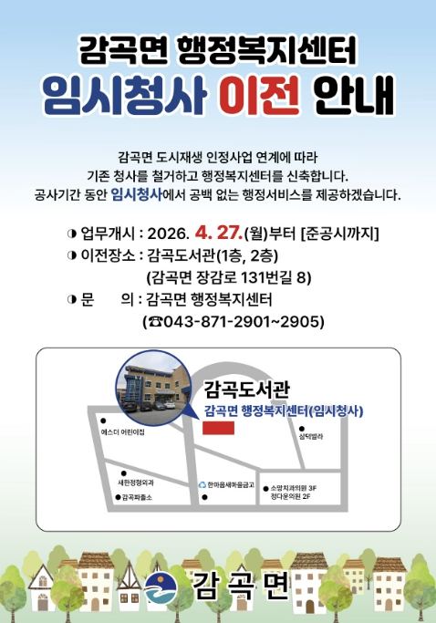 임시청사는 감곡도서관(감곡면 장감로131번길 8) 1층과 2층에 마련된다. 1층에는 복지팀과 민원팀이, 2층에는 총무팀·맞춤형복지팀·재무팀·산업개발팀이 배치되며, 운영 기간은 이달 27일부터 청사 준공 시까지이다.