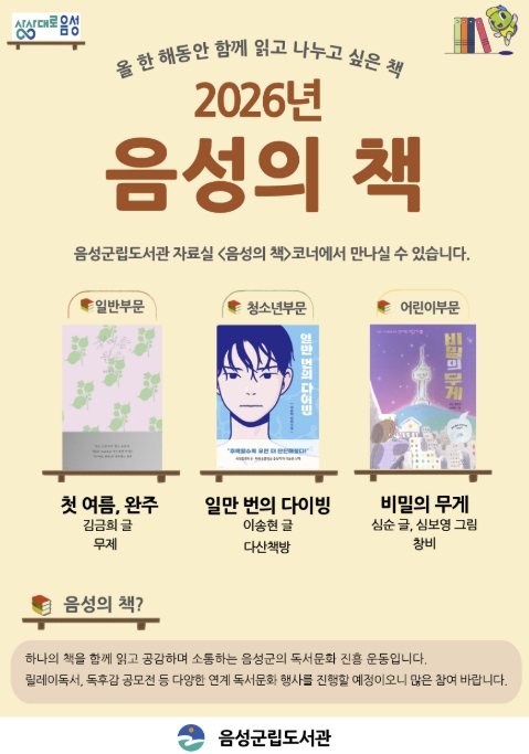 안은숙 문화복지국장은 “선정 과정에 군민이 직접 참여한 ‘음성의 책’이 지역사회 곳곳에서 소통과 공감의 매개가 되길 기대한다”며 “앞으로도 누구나 쉽게 책을 만나는 환경 조성과 독서 문화 확산을 위한 다양한 사업을 적극 추진하겠다”고 말했다.