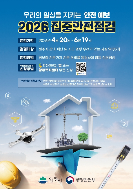 원주시 관계자는 “시민 여러분께서도 집중안전점검 기간 동안 안전한 원주 만들기에 적극 동참해 주시길 바란다”라고 말했다.