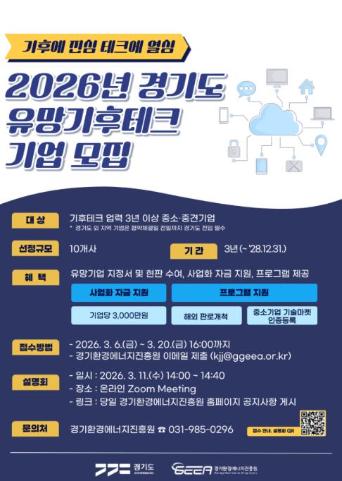 [파이낸셜경제=김기보 기자] 경기도와 경기환경에너지진흥원이 기후위기 대응을 선도할 혁신 기술 보유 기업을 발굴하기 위해 오는 3월 20일까지 ‘2026년 경기도 유망 기후테크 기업’ 10곳을 모집한다.