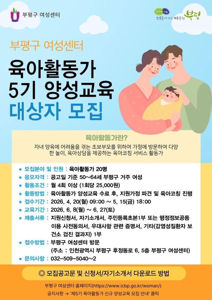 [파이낸셜경제=김기보 기자] 부평구는 오는 20일부터 5월 15일까지 육아활동가 20명을 모집한다고 밝혔다.
