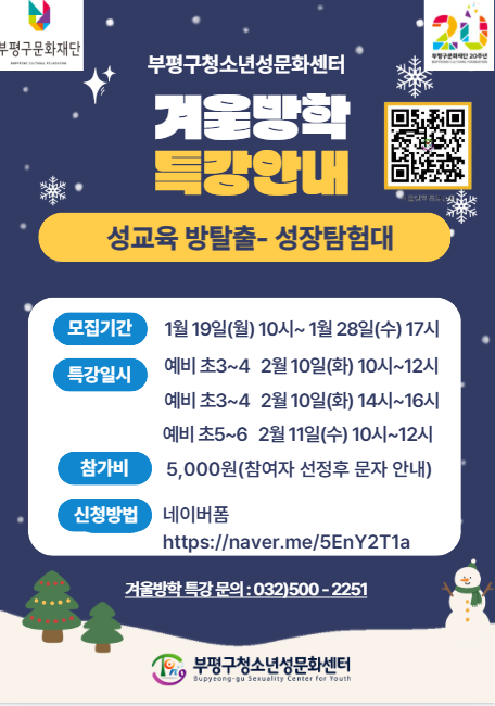 참가 신청은 네이버폼(https://naver.me/5EnY2T1a)을 통한 사전 접수로 진행되며, 부평구 초등학교 재학생 또는 거주 아동을 우선 선발한다. 자세한 사항은 부평구청소년성문화센터 누리집 및 카카오채널을 통해 확인할 수 있다.