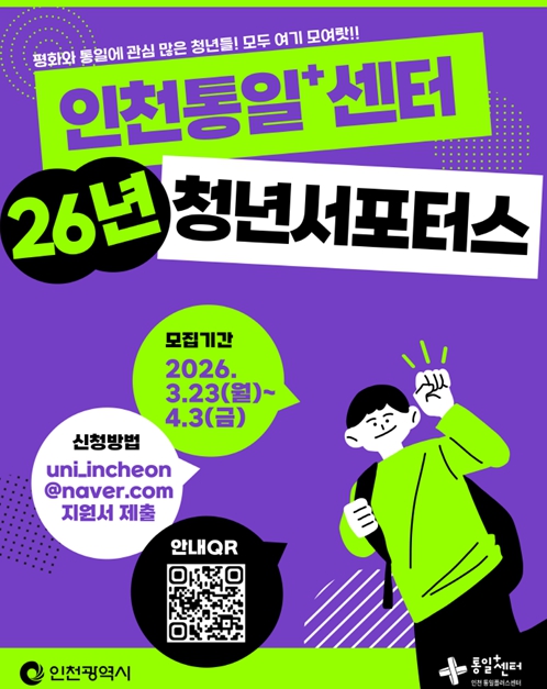 [파이낸셜경제=김기보 기자] 인천광역시는 청년 주도의 평화·통일 콘텐츠 제작과 확산을 위해 '2026년 인천통일+센터 청년서포터스'를 3월 23일부터 4월 3일까지 모집한다고 밝혔다.
