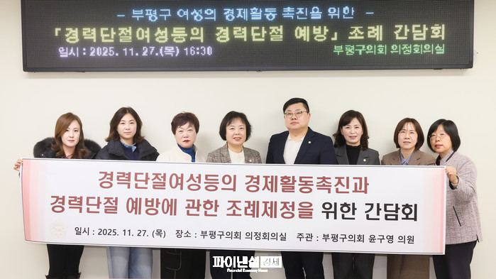 [파이낸셜경제=김기보 기자] 인천 부평구의회는 지난 27일 의회 의정회의실에서 윤구영 의원(국민의힘, 삼산2동, 부개2ㆍ3동)이 대표발의한 「인천광역시부평구 경력단절여성등의 경제활동 촉진과 경력단절 예방에 관한 조례」제정을 위한 간담회를 진행했다.