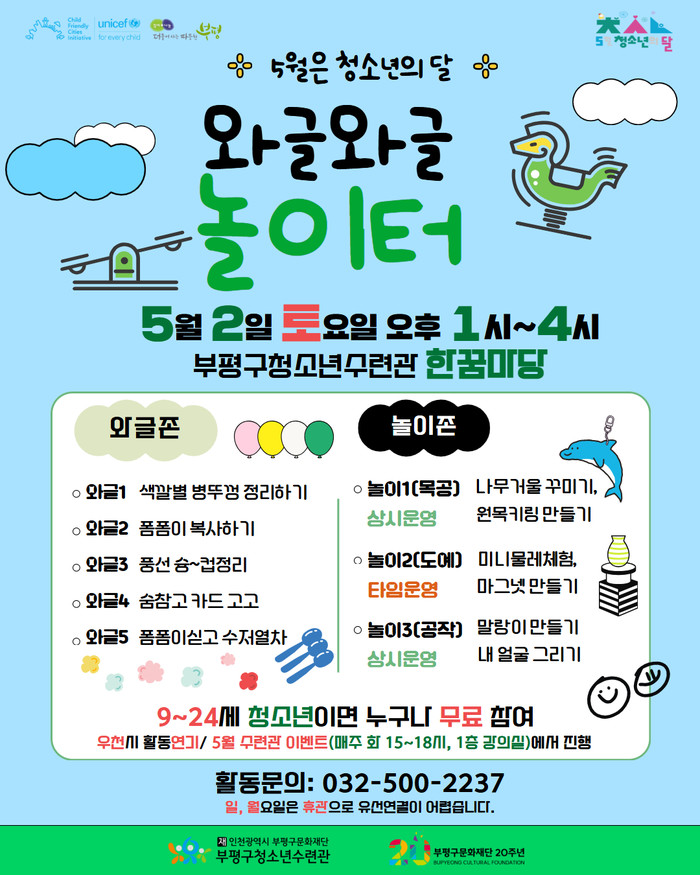 [파이낸셜경제=김기보 기자] 부평구청소년수련관은 오는 5월 2일 청소년 체험 행사 ‘와글와글 놀이터’를 운영한다고 밝혔다.