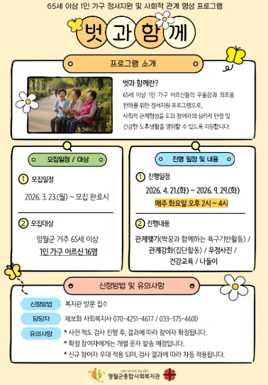 [파이낸셜경제=조성환 기자] 영월군종합사회복지관은 관내 65세 이상 1인 가구 어르신을 대상으로 정서 지원과 교류 확대를 위한 프로그램 ‘벗과 함께’ 참여자를 모집한다.