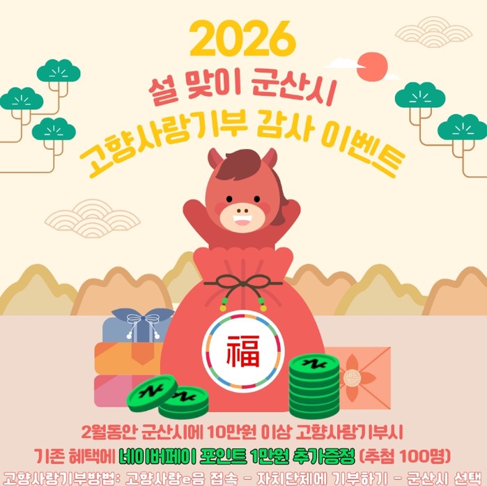 이번 행사는 설 연휴 기간을 포함해 2월 1일부터 28일까지 진행되며, 군산시에 10만 원 이상 고향사랑기부에 참여하면 자동으로 응모된다.