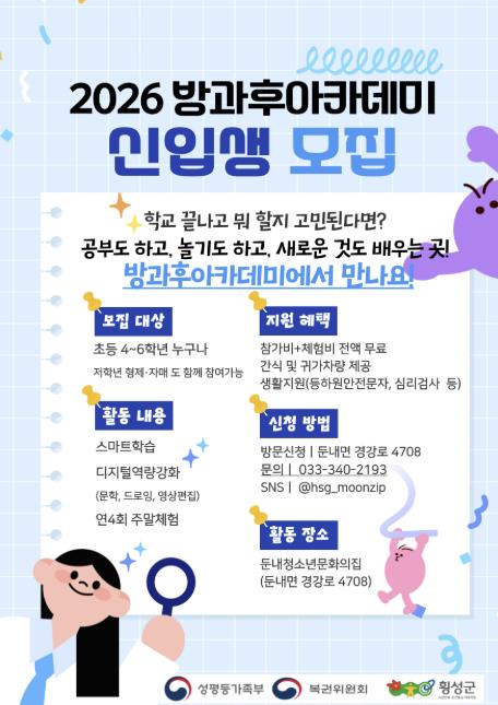 [파이낸셜경제=조성환 기자] 횡성군 둔내청소년문화의집이 지역 청소년의 균형 있는 성장을 돕기 위한 ‘2026년 방과후아카데미’ 신입생을 모집한다.